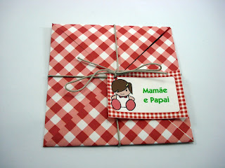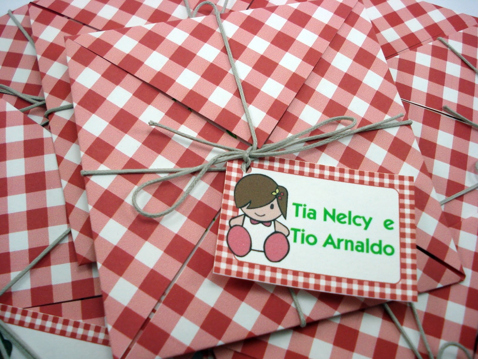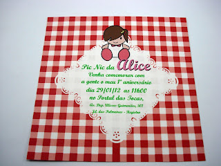 O convite ficou bem original, é uma tolha xadrez dobradinha! Detalhe: a menina que usamos para ilustrar os convites e lembrancinhas lembra muito a Alice!